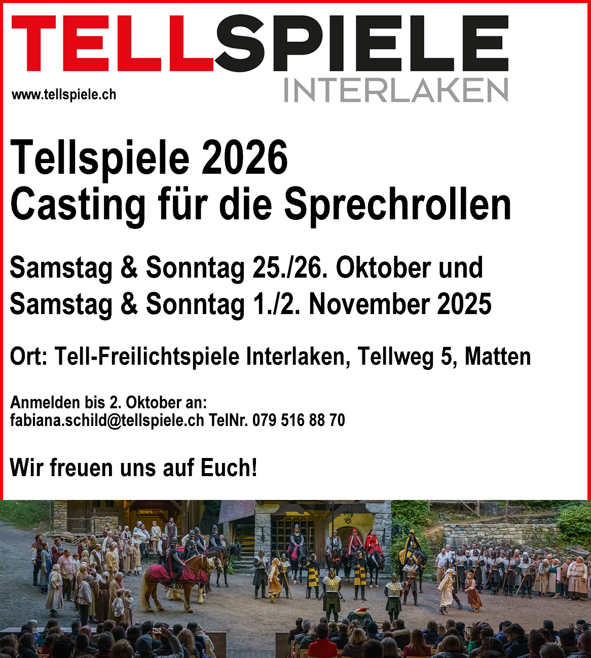 Unser Sekretariat bleibt vom Montag 22.09.2025 bis am Montag 13.10.2025 geschlossen. Wir sind dann ab Dienstag 14.10.2025 wieder für Sie erreichbar. Sie können uns in der Zwischenzeit eine Mail an info@tellspiele.ch senden. Die Mails werden sporadisch beantwortet.